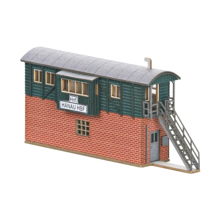 Dieser Bausatz aus lasergeschnittenem Architekturkarton bildet das bekannte Behelfsstellwerk "HANAU HBF Hnf" nach. Das Vorbild wurde nach dem Krieg als schnelle Behelfslösung aus einem Backsteinsockel mit einem aufgesetzten MCi Wagenkasten erstellt und blieb bis in die 1990er Jahre in Betrieb.